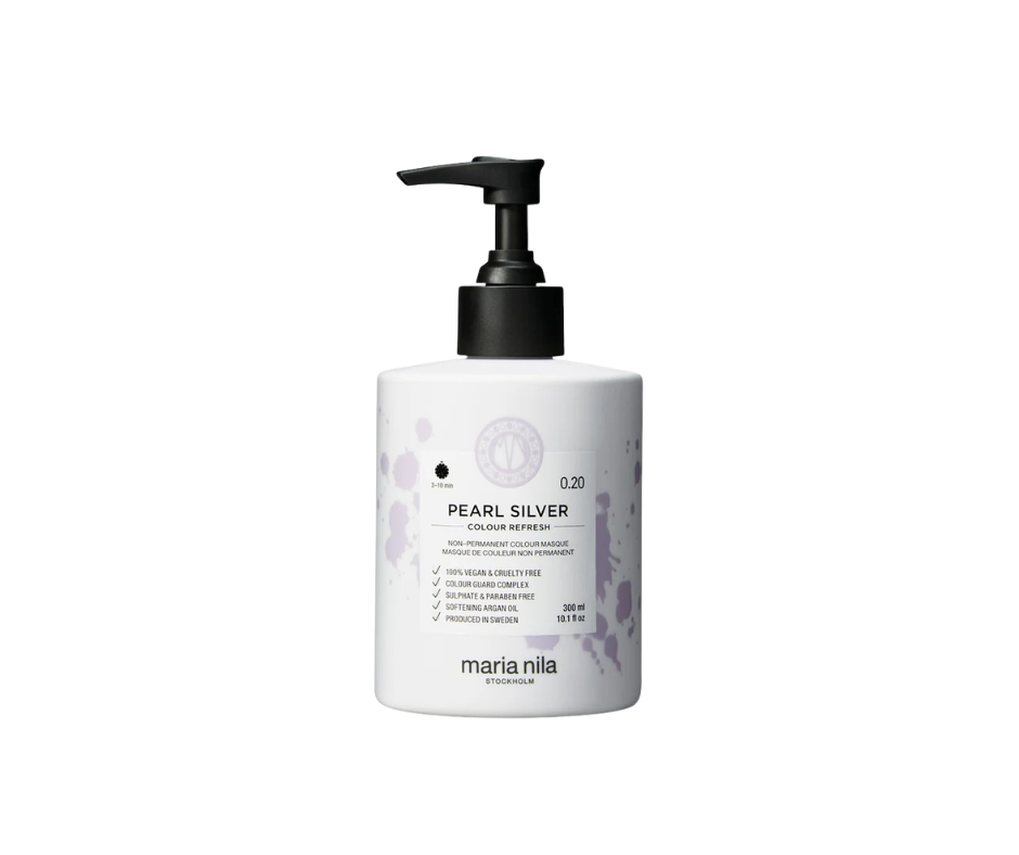 Le masque de couleur « Colour Refresh » 0.20 Pearl Silver de Maria Nila est un soin nourrissant et colorant aux pigments semi-permanents conçu pour rafraîchir, tonifier et intensifier les reflets froids argentés des cheveux blonds colorés ou décolorés.
